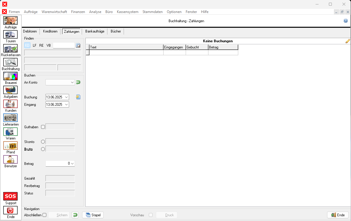 Um das Buchen von Zahlungseingängen mehrerer Rechnungen zu beschleunigen, steht eine Stapelbuchungsfunktion zur Verfügung. Das Modul wird im Hauptmenü Finanzen unter