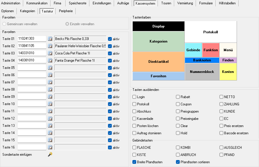 Register AdministrationRegister KommunikationRegister FirmaRegister SpeicherorteRegister EinstellungenRegister AufträgeRegister BuchhaltungRegister FormulareRegister HilfstabellenRegister Kassensystem#OptionenRegister Kassensystem#KategorienRegister Kassensystem#TastaturRegister Kassensystem#PeripherieRegister Kassensystem#KassenoptionenRegister Kassensystem#GebindeRegister Kassensystem#KassierenRegister Kassensystem#GutscheineRegister Kassensystem#BuchhaltungRegister Kassensystem#Cash&CarryRegister Kassensystem#Abschöpfung