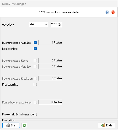 ein Optionsmenü an, dass die Option Abschluss für DATEV aufbereiten anbietet. In dem Dialog kann der Export dann konfiguriert und durchgeführt werden.