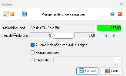 • Schnelle Erfassung mit Anzahl "1": Erlaubt eine noch schnellere Erfassung, in der nur die Artikelnummer eingegeben werden muss.