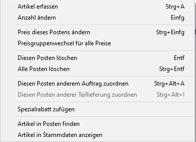 Besteht ein Auftrag aus mehreren Teillieferungen, können Posten auch zwischen diesen verschoben werden. Des Weiteren besteht die Möglichkeit, Posten einer neuen Teillieferung zuzuordnen. Wählen Sie dazu im Optionsmenü die Option Posten anderer Teillieferung zuordnen. Alternativ wählen Sie den Artikel an und drücken Strg + Alt + I.
