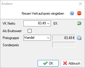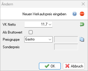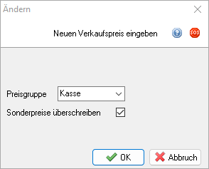 Der Dialog zur Änderung des Preises für die ausgewählte Warengruppe