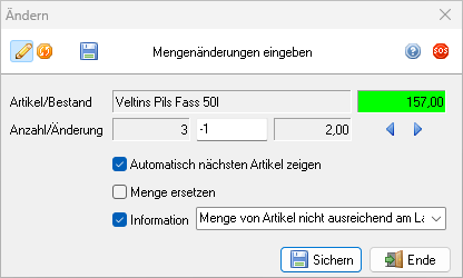 Wenn der Auftragsstatus vor der Erfassung als „Bestellung“ oder „Lieferschein“ deklariert wurde und der Artikel nicht in ausreichender Menge im Lager vorhanden ist, wird eine Warnmeldung ausgegeben: