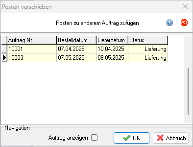 Um einen Posten an einen anderen Auftrag des jeweiligen Kunden zu übergeben[9], wählen Sie den Posten mit der rechten Maustaste an und im Optionsmenü die Option Posten anderem Auftrag zuordnen. Alternativ wählen Sie den Artikel an und drücken Strg + Alt + A. Im Dialog Posten verschieben werden in Abhängigkeit des Status des derzeitigen Auftrags alle Aufträge des aktuellen Kunden angezeigt, an die der Posten übergeben werden kann. Posten können nur an Aufträge im gleichen Status (Angebot, Bestellung und Lieferung) und zwischen Bestellung und Lieferung übergeben werden.