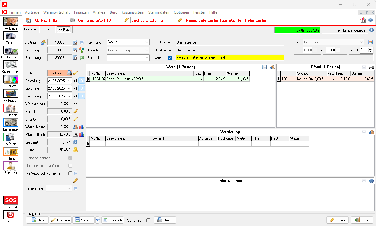hinter dem Status Rechnung kann der Auftrag als Rechnung deklariert und der Zahlungseingang sofort verbucht werden. Dies ist auch mit R (für Rechnung) und dann Strg + B möglich.