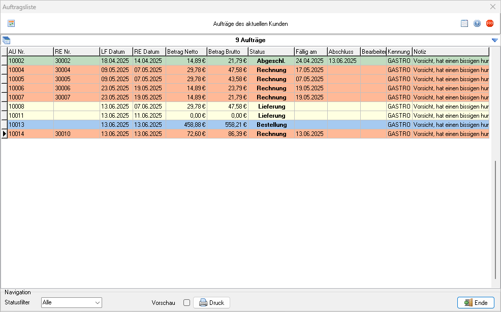 Eine Liste aller Aufträge des ausgewählten Kunden kann durch einen Klick auf die Auftragsnummer,
