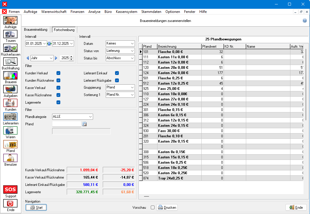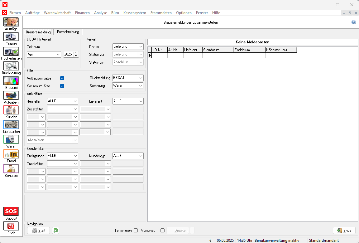 Brauereimeldungen stellen eine Statistikfunktion dar. Dabei werden die Meldeposten aller Kunden erfasst und eine spezielle GEDAT-Exportfunktion angeboten. Das Modul kann im Hauptmenü AnalyseBraueremeldung, mit Brauerei in der Seitenleiste der Anwendung oder Strg + F6 gestartet werden.