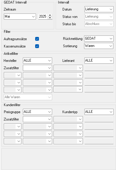 Optional können Gratiswaren gefiltert werden. Es können Artikel- und Kundenfilter ausgewählt und Unter- und Obergrenzen definiert werden. Die Filter müssen vor dem Start der Meldung ausgewählt werden.