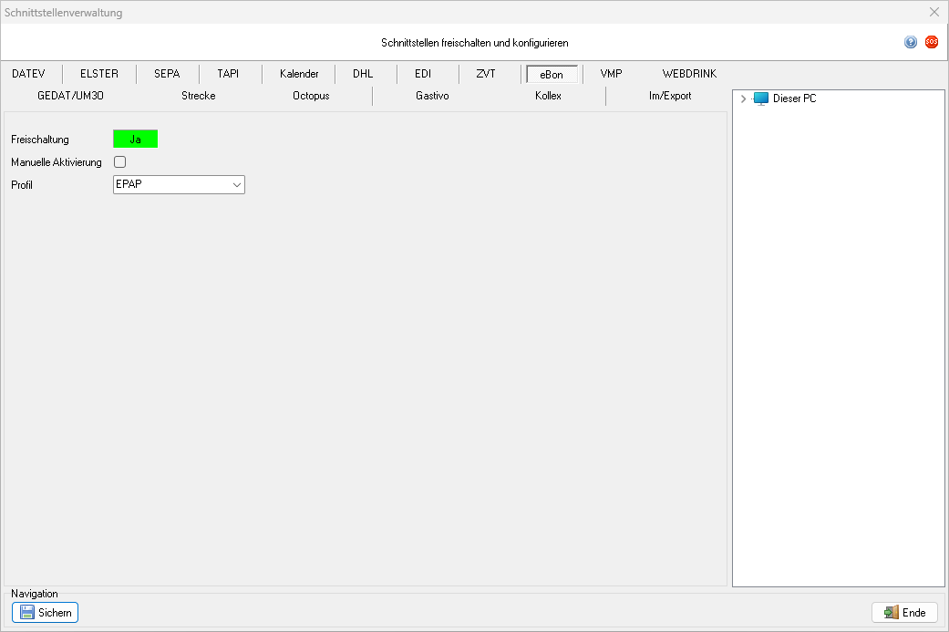 Um die eBon-Schnittstelle zu konfigurieren, muss zunächst die Schnittstellenkonfiguration aufgerufen werden: