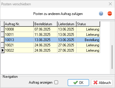 1. Rufen Sie die Terminrechnung auf, in die eine Lieferung verschoben werden soll. Diese ist der Zielauftrag.