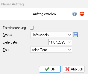 • Soll ein neuer Auftrag erstellt werden (keine Teillieferung), kann mit Nein geantwortet werden. Die Anwendung legt dann einen neuen Auftrag an, der als Angebot, Auftragsbestätigung, Lieferung oder Terminrechnung ausgeführt werden kann.