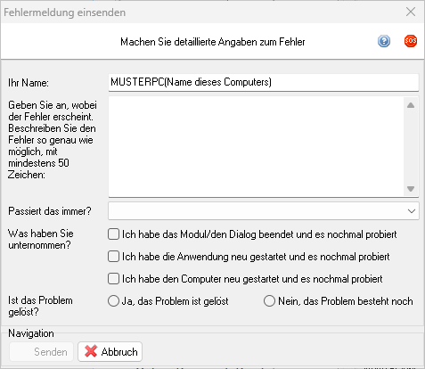 • Geben Sie an, ob Sie die Meldung immer wieder bei der gleichen Prozedur erhalten, das betroffene Modul oder das Programm versuchsweise neu gestartet haben oder im Zweifelsfall den Computer neu gestartet haben.