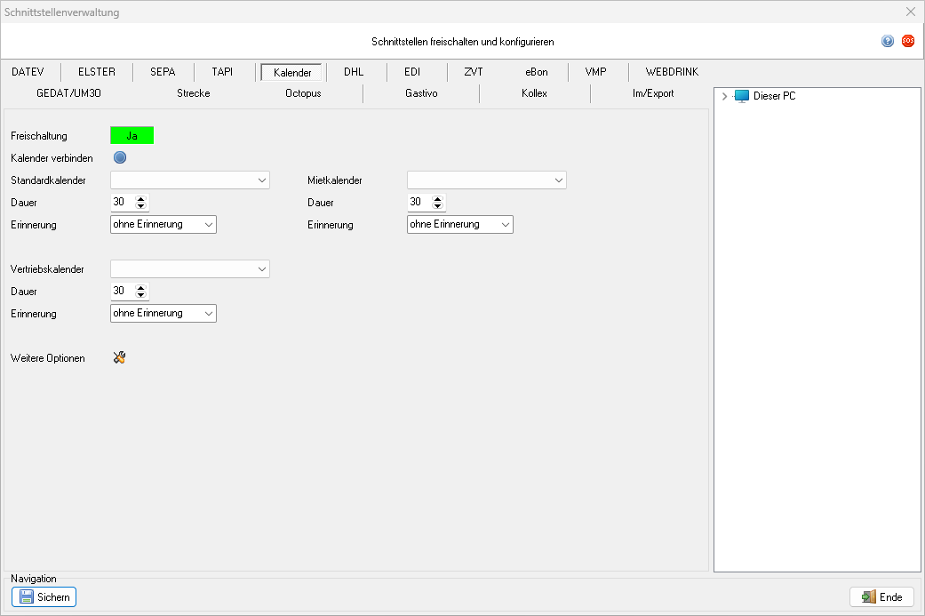 Schnittstellen müssen beim Hersteller aktiviert werden. Sie werden durch einen Dialog zur Aktivierung aufgefordert, wenn Sie die Freischalttaste