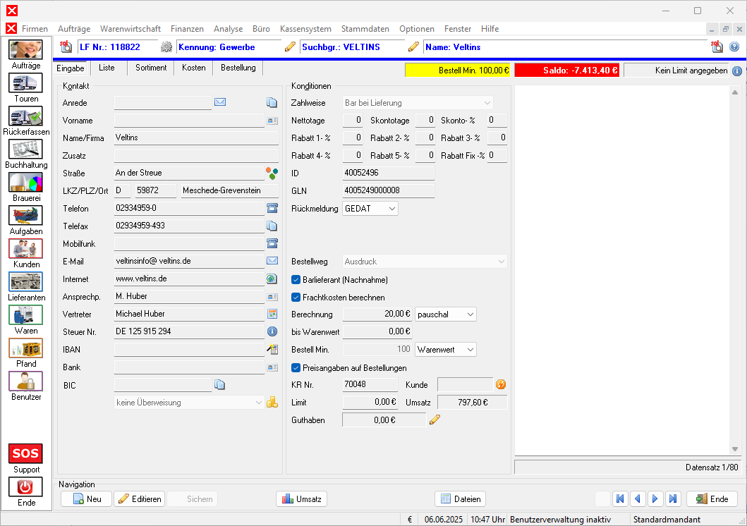 Im Lieferantenstamm werden u.a. das Sortiment eines Lieferanten sowie Bestellungen an diesen verwaltet und gepflegt. Die Lieferantenverwaltung kann im Menü Stammdaten →