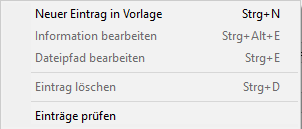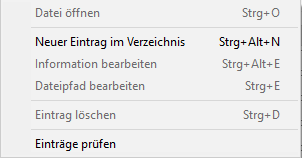 Um einen Eintrag aus der Tabelle zu entfernen, kann der Eintrag angewählt und mit → Eintrag löschen oder Strg + D entfernt werden. Wird die daraufhin erscheinende Rückfrage mit Nein beantwortet, so wird die Datei lediglich aus der Tabelle entfernt, aber nicht vom Datenträger gelöscht. Wenn die Datei hingegen physisch gelöscht werden soll, muss der Warndialog mit Ja beantwortet werden.