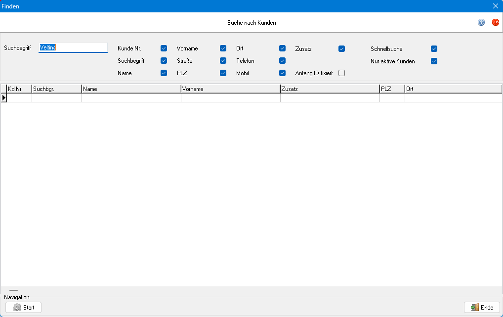 Die Suche wird durch Start oder ↵ gestartet. Die Ergebnisse werden in der Liste des Dialogs angezeigt. Nach der Suche kann mit den Pfeiltasten direkt durch die Ergebnisse navigiert werden. Durch einen Doppelklick auf einen Listeneintrag oder ↵ wird der markierte Datensatz im Register angewählt.