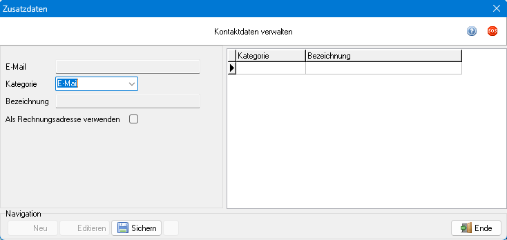 Mit Neu oder Strg + N kann ein neuer Datensatz angelegt werden. Ein bestehender Datensatz kann durch Auswahl in der Tabelle im rechten Bereich ausgewählt und durch Klick auf Editieren oder Strg + E bearbeitet werden. Die Bearbeitung einer Adresse wird mit Sichern oder Strg + S abgeschlossen. Zusatzadressen können mit oder Strg + D gelöscht werden.
