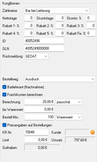 - Im Eingabefeld Bestell Min. kann eine Mindestbestellsumme entweder als Warenwert in Euro oder als Anzahl/Stück für diesen Lieferanten hinterlegt werden.