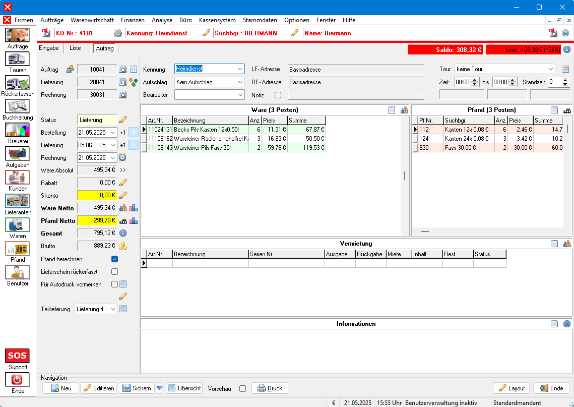 Für einfache Aufträge wird der Wechsel in den Status Rechnung im Statusdialog durchgeführt. Sofern in der Konfiguration der Buchhaltung aktiviert, wird nach dem Ausdruck der Rechnung eine Pfandfortschreibung ausgedruckt.