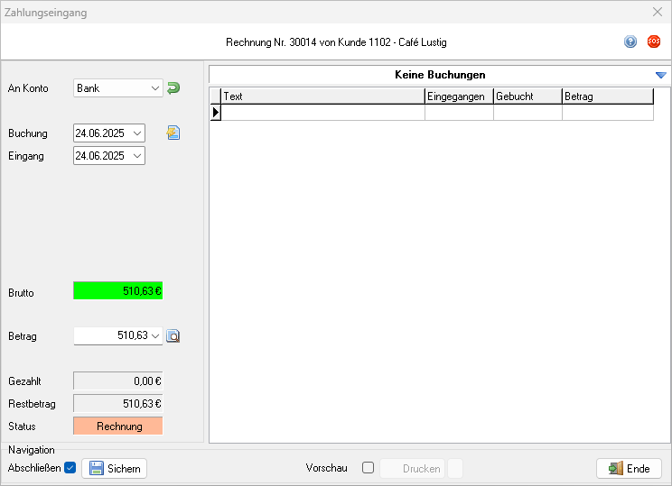 Sichern kann ein Auftrag, solange er sich im Status Rechnung oder Mahnung befindet, nach dem Sichern abgeschlossen werden.