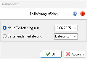Der Auswahldialog ist bei der Warenerfassung auf eine neue Teillieferung voreingestellt und bei der Pfanderfassung auf die letzte Teillieferung.