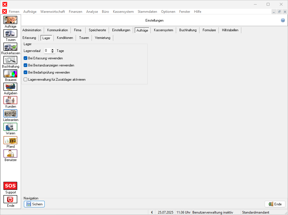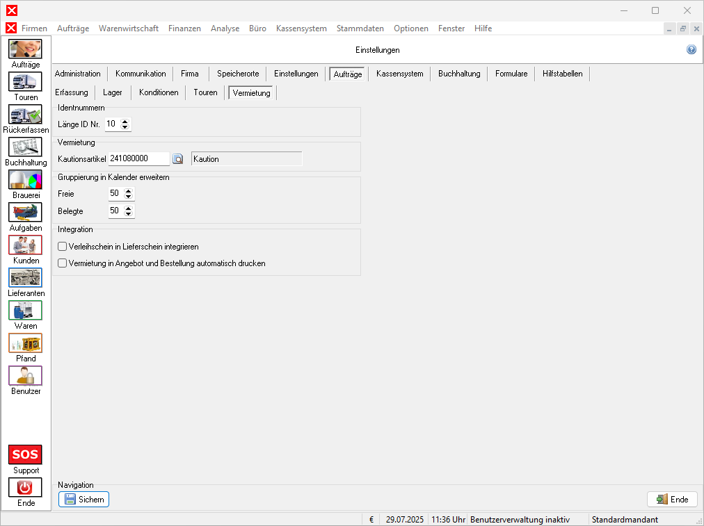 Register AdministrationRegister KommunikationRegister FirmaRegister SpeicherorteRegister EinstellungenRegister KassensystemRegister BuchhaltungRegister FormulareRegister HilfstabellenRegister Aufträge#LagerRegister Aufträge#ErfassungRegister Aufträge#TourenRegister Aufträge#VermietungRegister Aufträge#OptionenRegister Aufträge#Warenwirtschaft