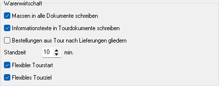 In der Gruppe Warenwirtschaft können Sie Einstellungen zur Sortierung und zum Inhalt von Dokumenten innerhalb der Warenwirtschaft treffen. Außerdem ist es möglich Standzeiten bei Kunden, sowie flexible Tourstarts- und ziele bei geplanten Touren zu berücksichtigen.
