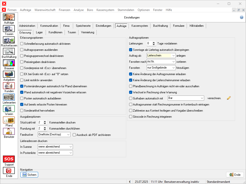 Register AdministrationRegister KommunikationRegister FirmaRegister SpeicherorteRegister EinstellungenRegister KassensystemRegister BuchhaltungRegister FormulareRegister HilfstabellenRegister Aufträge#LagerRegister Aufträge#KonditionenRegister Aufträge#TourenRegister Aufträge#VermietungRegister Aufträge#Erfassung#ErfassungsoptionenRegister Aufträge#Erfassung#AusgabeoptionenRegister Aufträge#Erfassung#Lieferadressen druckenRegister Aufträge#Erfassung#Auftragsoptionen