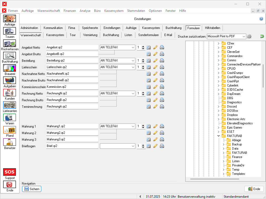 Beim ersten Start der Anwendung wird allen Druckfällen der Windows-Standarddrucker[2] zugewiesen. Dieser Standarddrucker wird auch im Auswahlfeld „Drucker zurücksetzen“ oberhalb des Explorerfensters angezeigt. Mit (Drucker zuweisen) hinter diesem Auswahlfeld kann der gewählte Drucker auf alle Druckfälle übertragen werden. Mit (Formulareinstellungen zurücksetzen) werden alle Formularnamen auf die werksseitigen Voreinstellungen zurückgesetzt.
