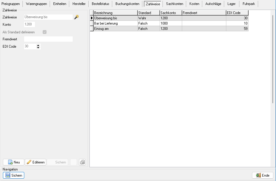 In diesem Register werden Tabellendaten für Zahlweisen gepflegt. Um eine neue Zahlweise zu erstellen, geben Sie eine Zahlweise und ein Sachkonto ein. Alternativ kann mit Hilfe von