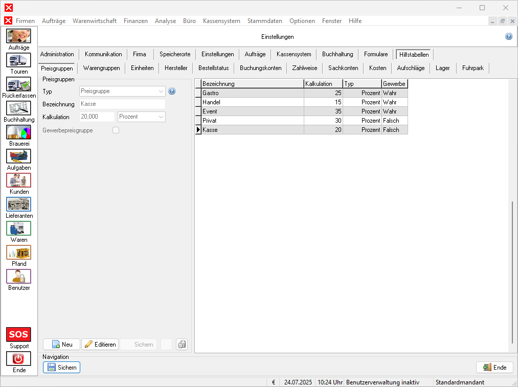 - Zusätzlich können Sie die Option Gewerbepreisgruppe aktivieren, falls es sich um ein Gewerbe handelt. Bei einer privaten Preisgruppe wird in der Preisverwaltung des Warenstamms der Brutto Verkaufspreis angezeigt, bei einer Gewerbepreisgruppe hingegen der Netto Verkaufspreis.