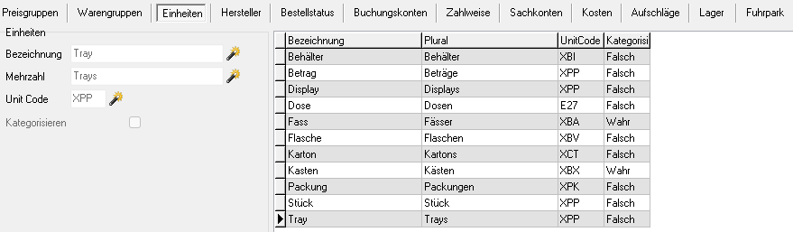 Unter Mehrzahl können Sie die Pluralform erfassen, die beim Drucken verwendet wird (z. B. „20 Fässer“ statt „20 Fass“).