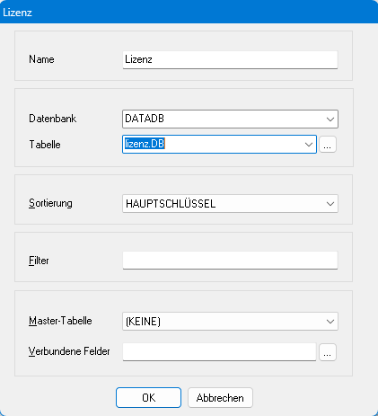 1. Tragen Sie eine beliebige Bezeichnung im Feld „Name“ ein, wählen Sie aus der Auswahloption „Datenbank“ den Alias „RECHTABDB“ und im Auswahlfeld „Tabelle“ die „rechtab.db“ aus.
