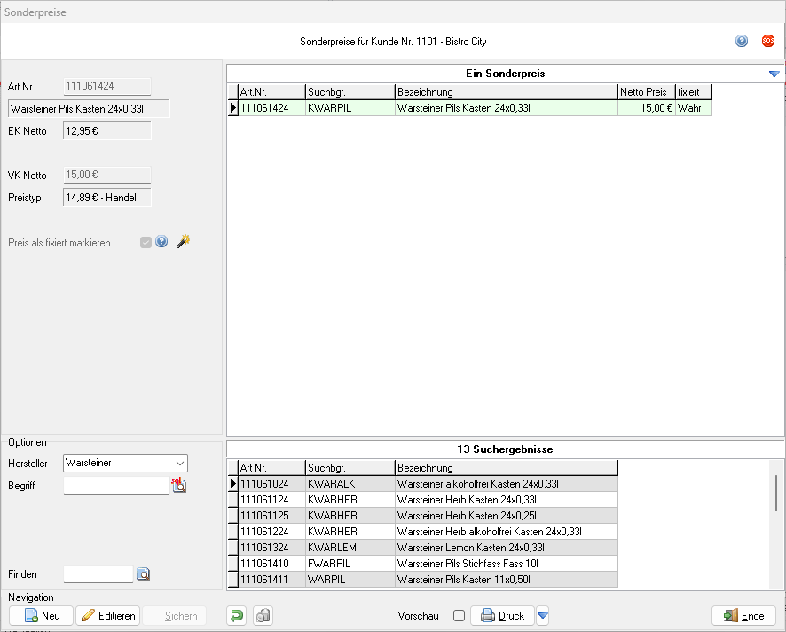 Eine Sonderpreisvorlage kann bei einem beliebigen Kunden eingelesen werden.