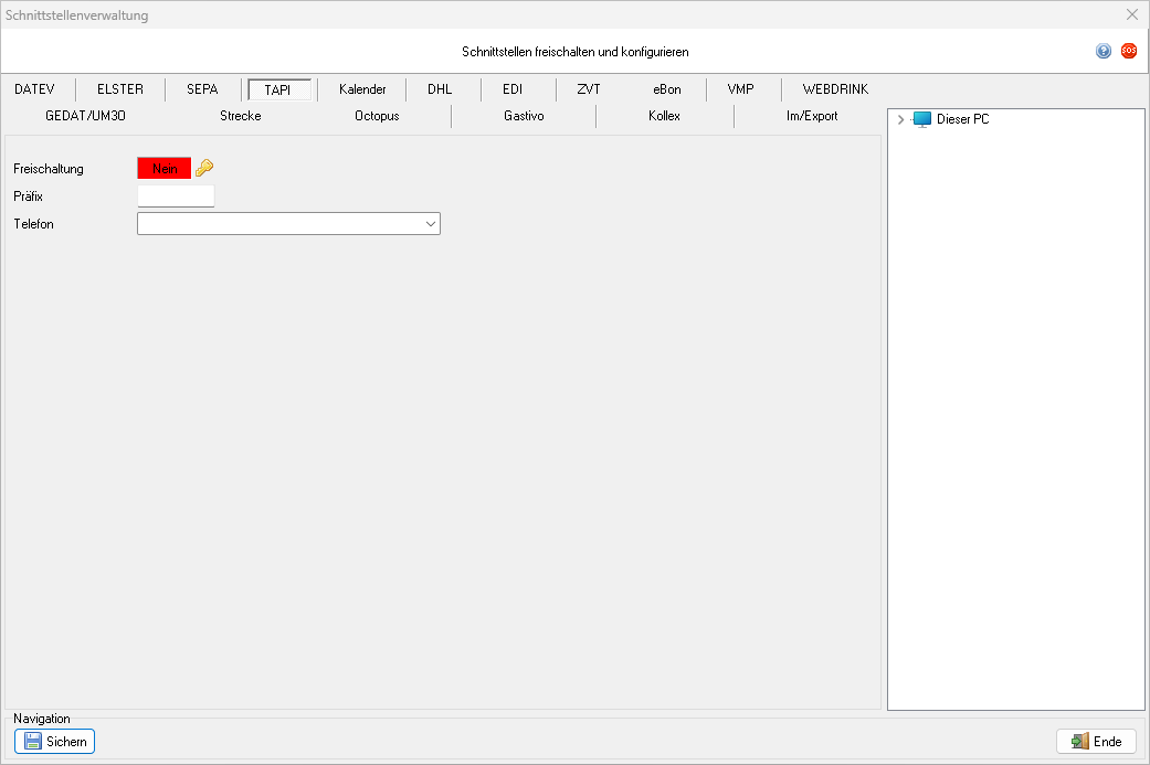 Schnittstellen müssen beim Hersteller aktiviert werden. Sie werden durch einen Dialog zur Aktivierung aufgefordert, wenn Sie die Freischalttaste rechts neben der roten Statusanzeige einer bisher nicht aktivierten Schnittstelle anklicken[1].