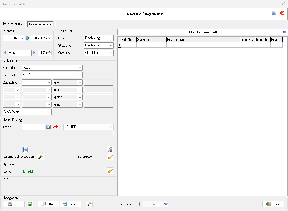 Um eine Brauereimeldung für den aktuellen Kunden zu erstellen, können Intervall- und Artikelfilter justiert und das Meldeintervall bestimmt werden. Das Meldeintervall wird in Abhängigkeit der letzten Brauereimeldung voreingestellt. Dabei wird der Folgetag des Endzeitraumes der letzten Meldung als Startwert, der heutige Tag als Endwert eingestellt. Das Intervall kann nach Wunsch angepasst werden. Sofern keine Waren von einem Hersteller im Lager sind, wird das Programm eine Fehlermeldung ausgeben.