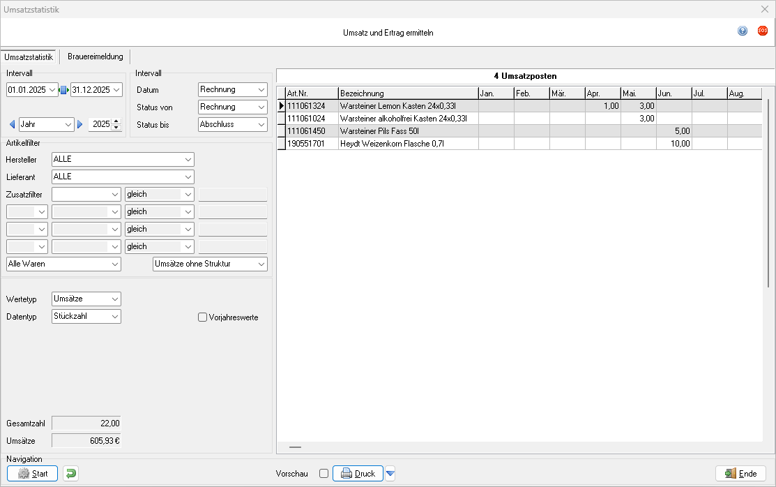 In Brauereimeldungen werden Waren nicht in Stückzahlen, sondern als Volumen in Litern ausgegeben. Es werden nur Waren ausgewertet, die zuvor mit dem aktuellen Kunden verknüpft wurden.